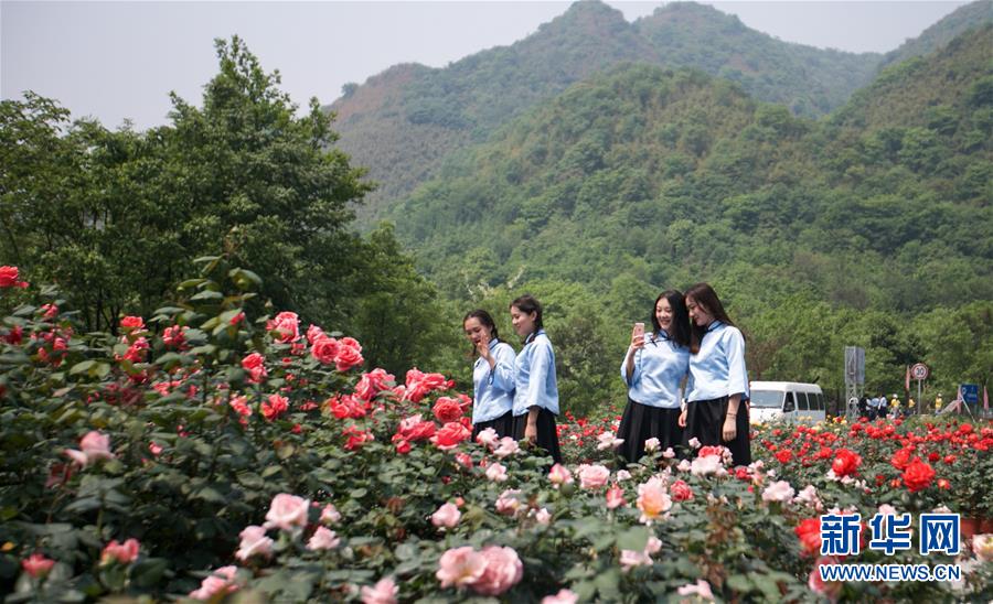 来自成都的大学生在位于四川绵竹市的“中国玫瑰谷”游览拍照(4月18日摄)。新华社记者 张帆 摄