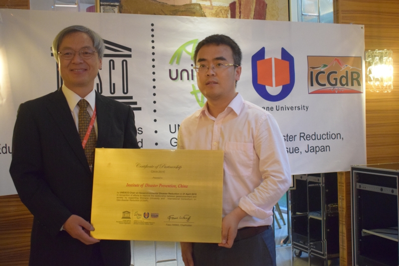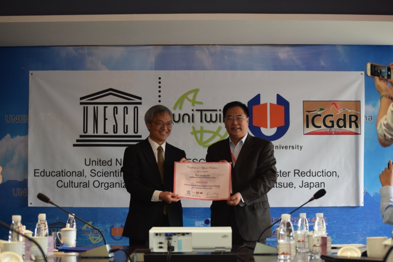 汪发武讲席教授向防灾科技QY千亿国际颁发UNESCO国际协作单位证书
