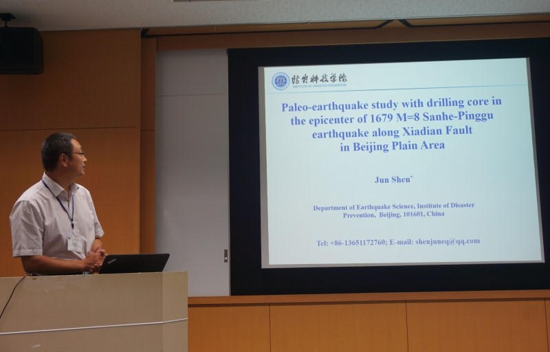 沈军教授以《Paleo-earthquake study with drilling core in the epicenter of 1679 M=8 Sanhe-Pinggu earthquake along Xiadian Fault in Beijing Plain Area》为题,介绍了利用钻孔结合浅层地震、探槽和年代测量技术研究钻孔岩芯中的古地震现象,总结了三种环境下岩芯中典型的古地震现象,识别出12万年以来“1679年三河—平谷8级地震极震区”夏垫断裂上发生的29次古地震事件,并估计了这些古地震的震级、离逝时间和复发间隔,建立了长时间尺度的强震序列,为评价该地区的地震危险性提供了更全面的古地震信息,进而估计了该断裂现今地震危险性。