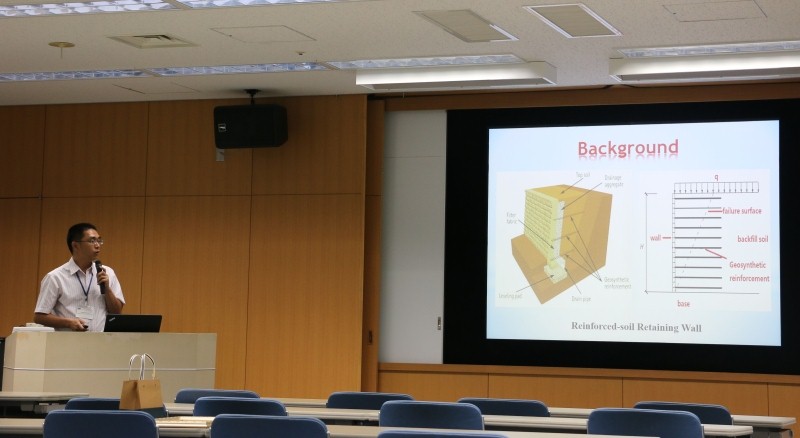 蔡晓光教授以《Dynamic characteristics of two-steps reinforced-soil retaining wall in shaking table tests》为题,介绍了加筋土挡墙震害、双级加筋土挡墙室内振动台模型试验设计、试验结果以及建立的加筋土挡墙潜在破坏面计算模型等。