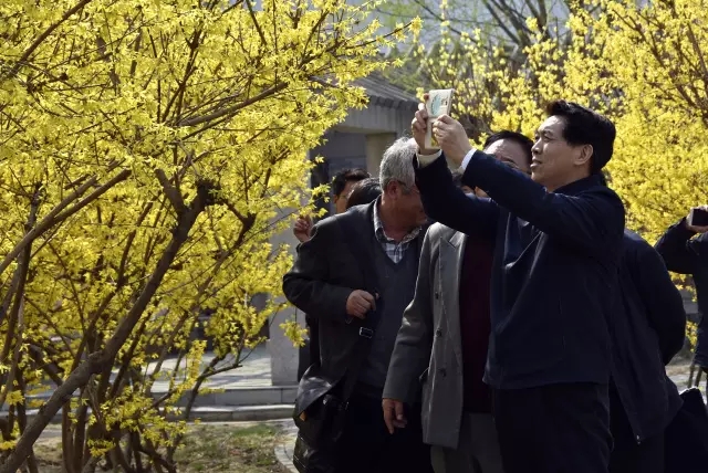 来到特色园林——问地苑,满眼的葱绿和盛开的连翘花使校园生机盎然,让人神清气爽。郑国光饶有兴致地拿出手机记录下这防灾春天的美景。