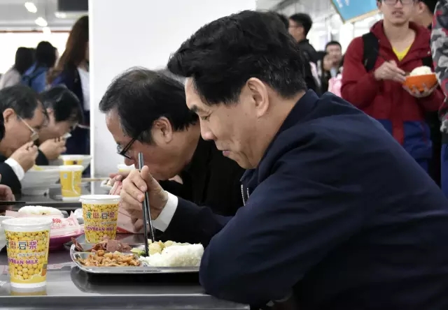 郑国光一行抵达QY千亿国际先调研学生食堂。他走进北校区望舒餐厅,详细了解餐厅的伙食标准和饭菜质量、学生的学习情况和生活条件,并与学生共进午餐。他以生为本的言行、亲切的话语、和蔼的笑容,给师生留下了深刻印象。一份简单套餐和一杯豆浆,郑国光吃得津津有味。不时有同学用手机记录下这难忘的一刻。局长颜值还蛮高的!