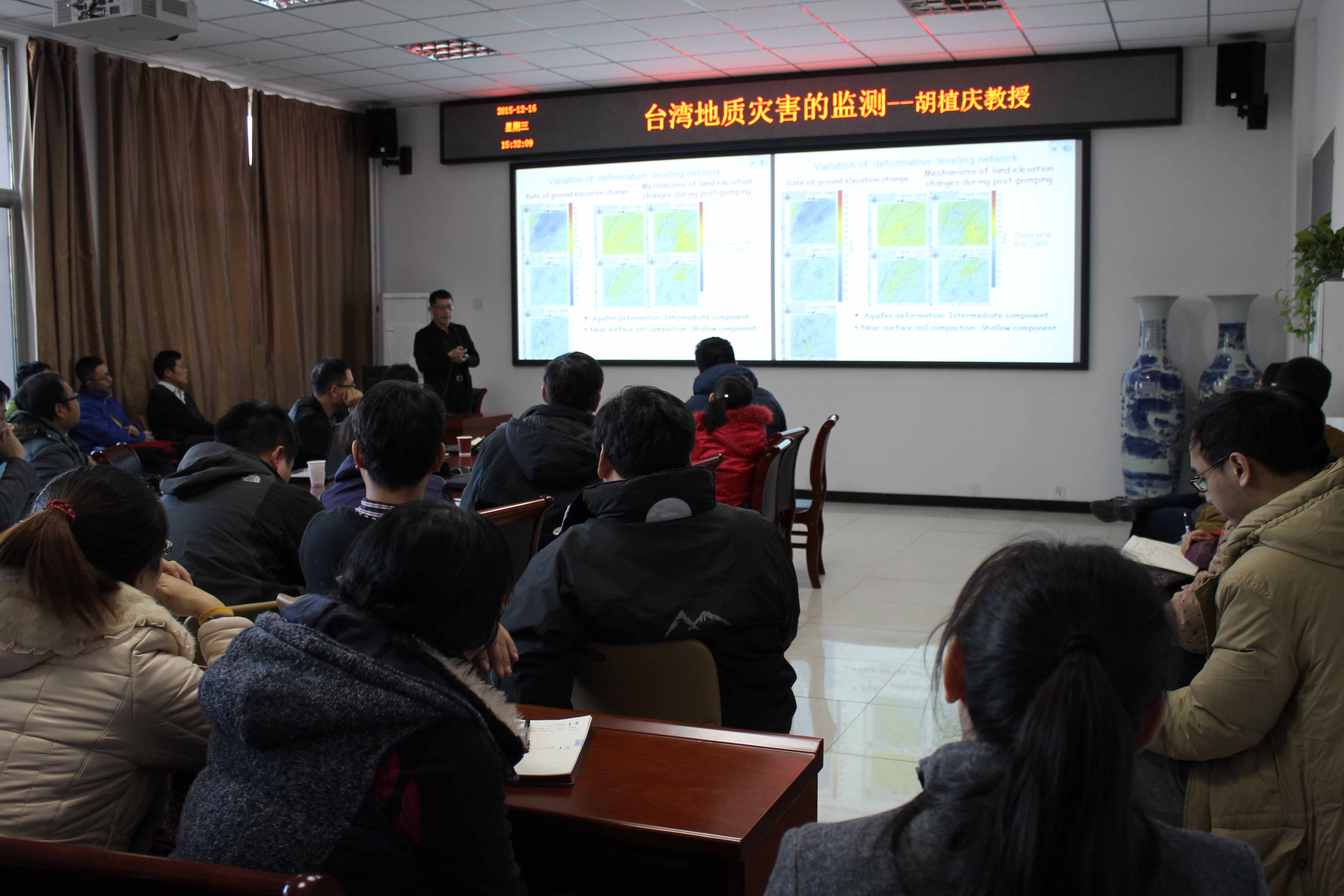 胡植庆教授以“台湾地质灾害的监测”为题,结合大量观测实例,详细介绍了持久散射体合成孔隙雷达干涉(PS-InSAR)在台湾地质灾害监测方面的应用,展示了该方法目前取得的最新研究成果,并与GPS连续测量结果进行了比较分析;同时介绍了该技术在考古等其他方面的应用。