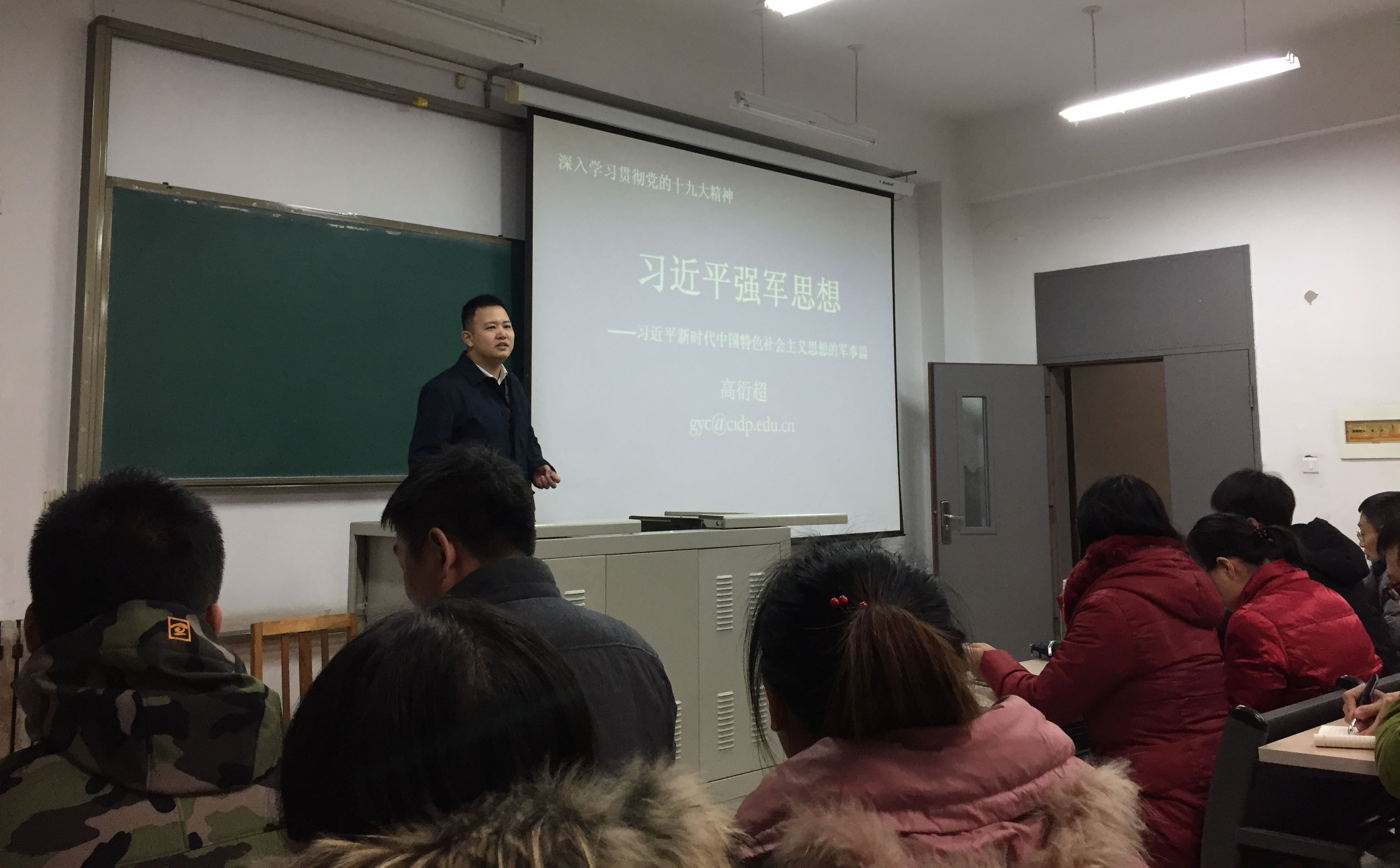 为深入学习贯彻党的十九大精神,切实把广大党员的思想和行动统一到党的十九大精神上来,2017年12月14日,思政部高衍超老师到我系为党员、入党积极分子作党的十九大精神专题辅导报告,报告主题为“习近平强军思想”,会议由系党总支书记达勇主持。