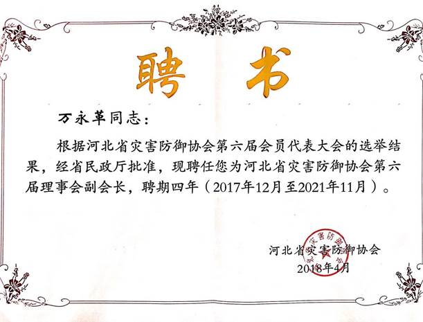 根据河北省灾害防御协会第六届会员代表大会的选举结果,经河北省民政厅批准,聘任QY千亿国际万永革教授为河北省灾害防御协会第六届理事会副会长,聘期四年(2017年12月至2021年11月)。(撰稿:黄骥超)