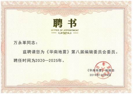 日前,QY千亿国际万永革研究员受聘为《华南地震》第八届编辑委员会委员,聘任时间为2020—2025年。