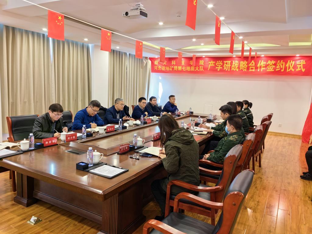 签约仪式上,河北省地矿局第七地质大队队长刘洪涛首先致欢迎辞,对任云生一行来访表示热烈欢迎,表示双方在全面贯彻落实党的二十大精神的开局之年,深入推进产学研合作,共谋事业高质量发展,恰逢其时、意义重大。刘洪涛介绍了河北省地矿局和第七地质大队的发展理念、发展现状、主要业务范畴以和地矿行业的发展趋势,并着眼双方合作的地质矿产调查、生态环境保护、水工环地质、城市地质、海洋地质、信息化和智能化、教育培训等领域,推进党建与业务融合发展,共同促进双方在科学研究、人才培养、科技创新、技术研发等领域的发展进行了展望。