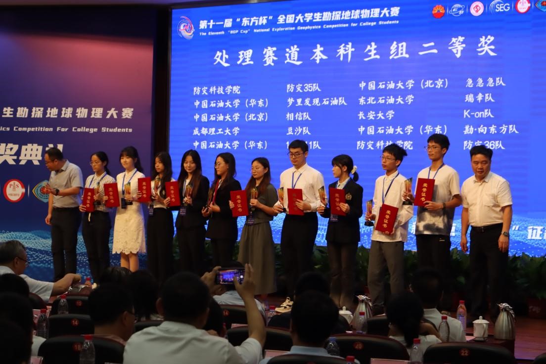 第十一届“东方杯”全国大学生勘探地球物理大赛由中国石油集团东方地球物理勘探有限责任公司、油气勘探计算软件国家工程研究中心、中国石油大学(北京)、国际勘探地球物理学家学会(SEG)、中国地球物理学会、中国石油学会石油物探专业委员会主办,中国石油大学(北京)、中国石油集团东方地球物理勘探有限责任公司、SEG中国、复杂油气藏勘探开发教育部工程研究中心承办。本次大赛共设有解释赛道、处理赛道本科生组和研究生组3个赛道,其中解释赛道为新增赛道。此次竞赛共有来自全国21家参赛单位的595支队伍参加比赛,经过激烈的角逐,防灾35队(熊贤材,王玺)、防灾36队(曾如瑶,王冰洁)获得二等奖;防灾30队(张正瑞,刘宇)、防灾43队(熊郴皓、刘毅博)、防灾46队(史文斌、冉健舟)获得三等奖。