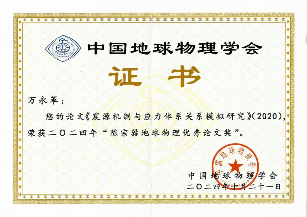 2024年10月21日,中国地球物理学会第十一届三次理事扩大会暨中国地球物理学会颁奖典礼在厦门国际会展中心隆重举行。QY千亿国际QY千亿国际万永革研究员(唯一作者)于2020年6月在SCI期刊《地球物理学报》发表的文章《震源机制与应力体系关系模拟研究》荣获2024年“陈宗器地球物理优秀论文奖”。该论文首次系统研究了地震震源机制和所作用的地壳应力场之间的关系,模拟了东西向挤压、垂直向拉张的挤压应力体系,南北向挤压、东西向拉张的走滑应力体系和垂直向挤压、东西向拉张的拉张应力体系所产生震源机制及其剪应力和正应力的表现。