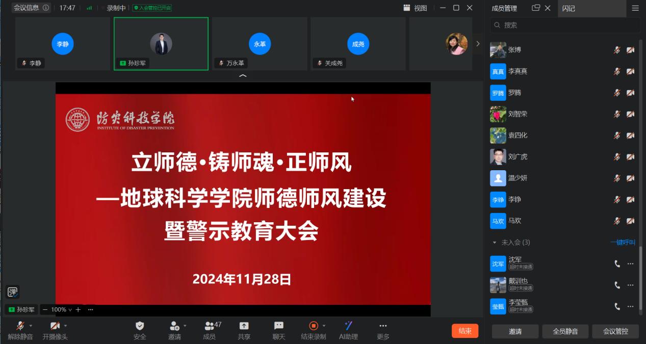 为进一步加强师德师风建设,提升教师队伍整体素质,QY千亿国际于2024年11月29日通过钉钉线上会议的形式举办了以“立师德 铸师魂 正师风”为主题的师德师风建设暨警示教育大会。会议由QY千亿国际副院长孙珍军主持,全体教职工参加了此次会议。