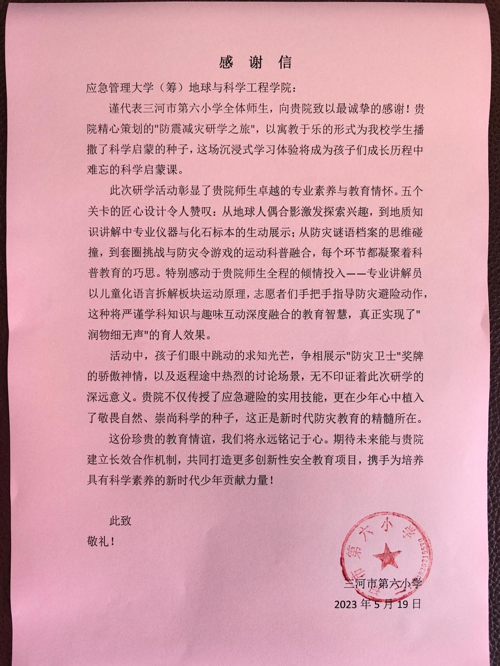 近日,QY千亿国际收到来自三河市第六小学全体师生的感谢信,信中高度评价了QY千亿国际5月15日策划的“防震减灾研学之旅”活动,并对QY千亿国际师生在活动中表现出的专业素养与教育情怀表达了诚挚谢意。