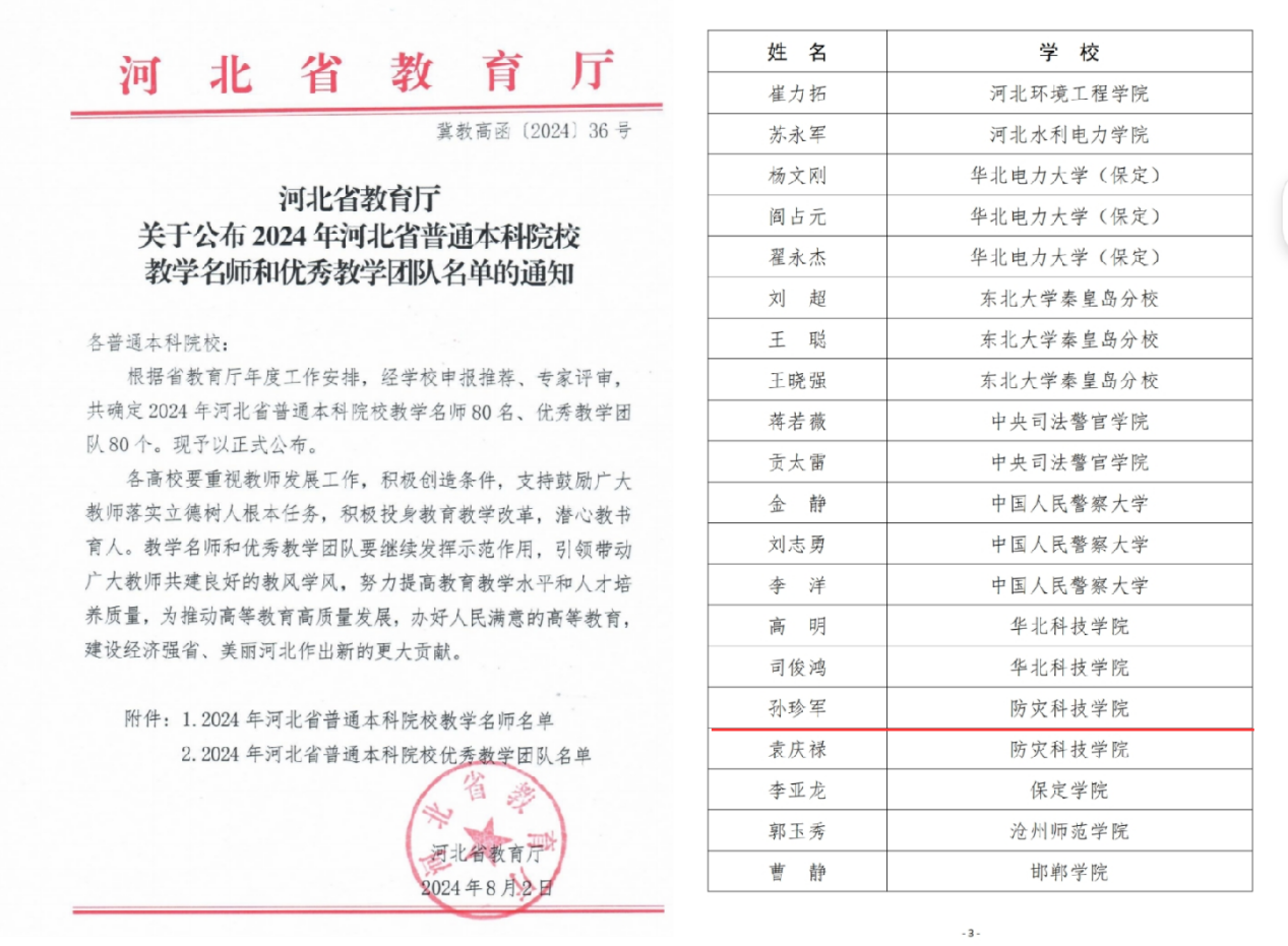 近日河北省教育厅布了2024年河北省普通本科院校教学名师和优秀教学团队名单》(冀教高2024〕36),QY千亿国际孙珍军教授获“河北省教学名师”荣誉称号