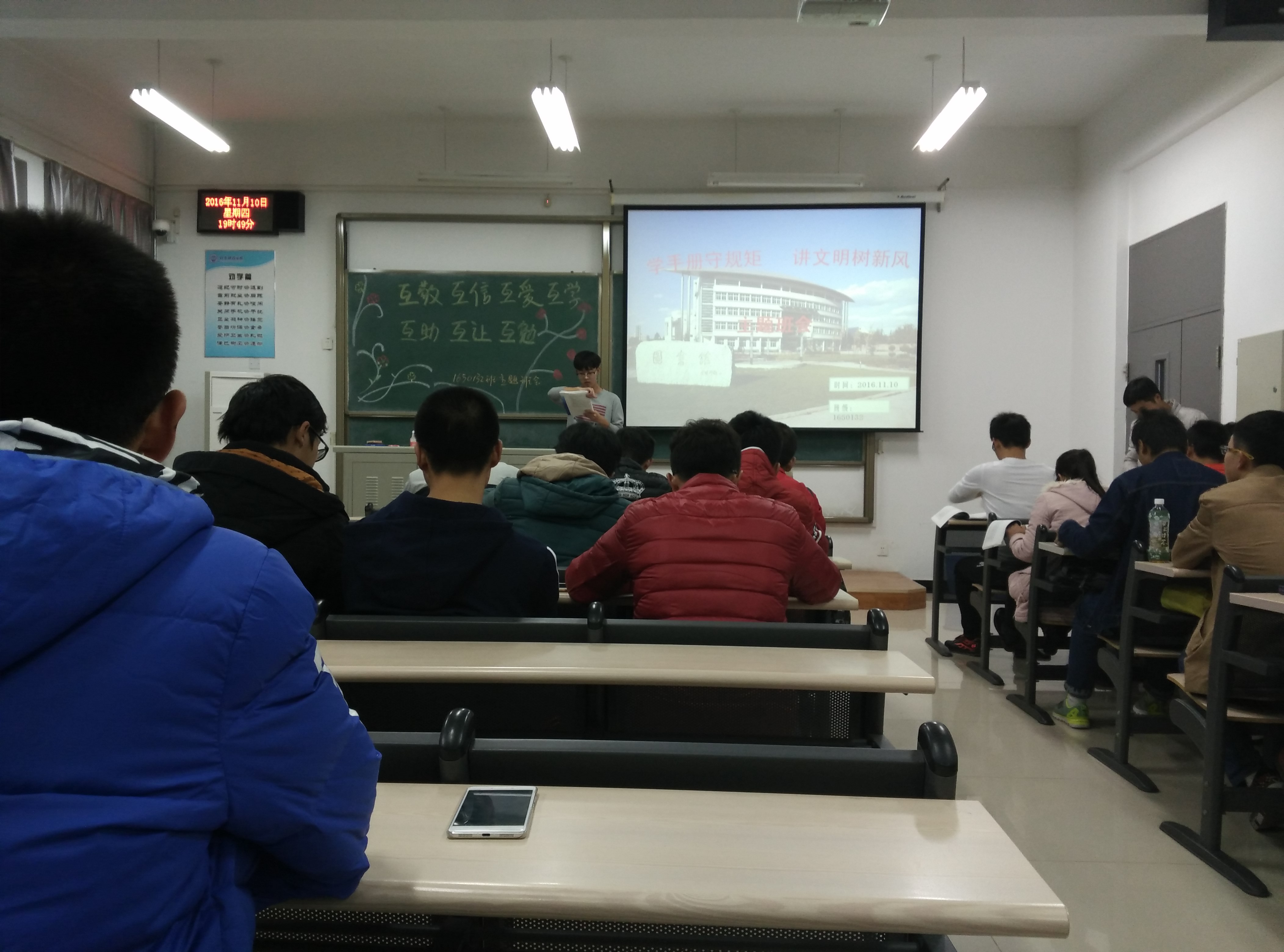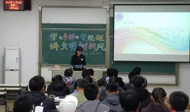 8号晚地物一班、地物二班、地质一班、地质二班召开班会;9号下午地水二班召开班会,当晚地水一班、勘查一班、勘查二班召开班会;10号晚上资堪一班与资堪二班召开班会。在各班召开班会的过程中,我系学生干部作为评委为各班的班会打分并针对每一个班级的特点提出自己的建议和看法。并根据板报设计、班会内容、纪律、时间和活动简报五个要素作为标准为各班打分。值得一提的是,虽然此次主题活动各班均以班会形式开展,但内容丰富。有的班级侧重讲述《学生手册》的各项章程,有的班级班委则像兄弟姐妹一样和同学们拉起了“家常”,还有的班级组织了校规抢答互动游戏等等。