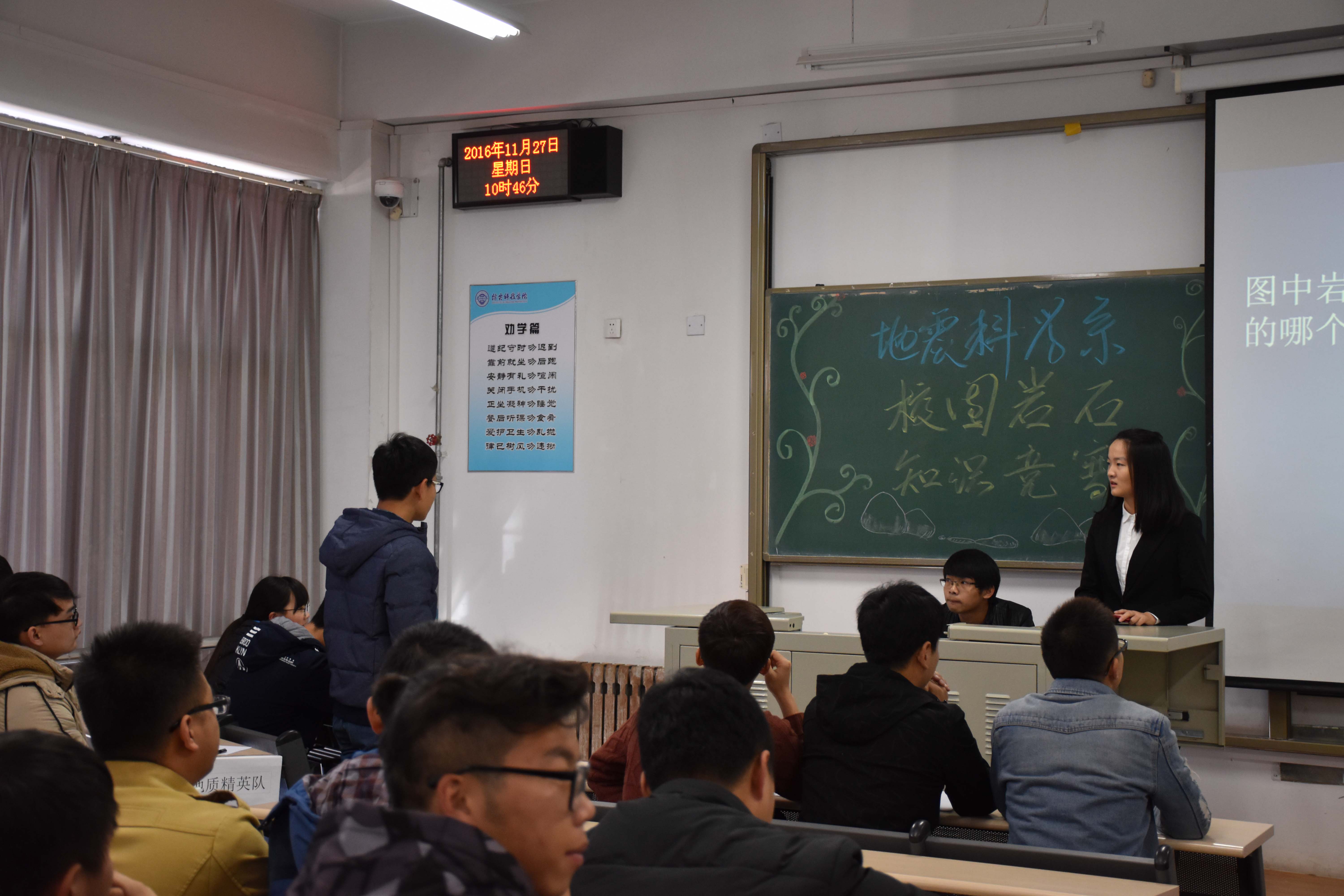 11月27日上午,地震科学系在长庚楼301教室举办了第二届校园岩石知识竞赛。出席本次比赛的评委有岩石爱好者协会会长薛红盼、水环境保护协会会长郭子恺、青年志愿者协会会长李浩、地质爱好者协会副会长庄延会。