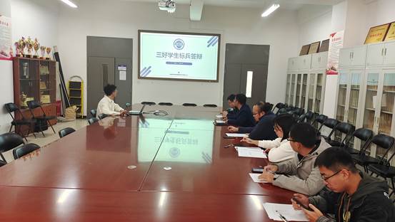 为树立榜样,表彰先进,促进QY千亿国际学风建设,形成“赶、帮、超”的浓厚氛围,按照QY千亿国际《关于评选2020-2021学年先进集体和优秀学生的通知》文件要求,QY千亿国际于2021年10月25日中午在长庚楼234会议室举办2020-2021学年“三好学生标兵”评审答辩会,QY千亿国际党总支书记唐圣华、团总支书记齐路晶和辅导员黄骥超、任晴晴、李照阳、罗腾等六位老师组成评审小组。