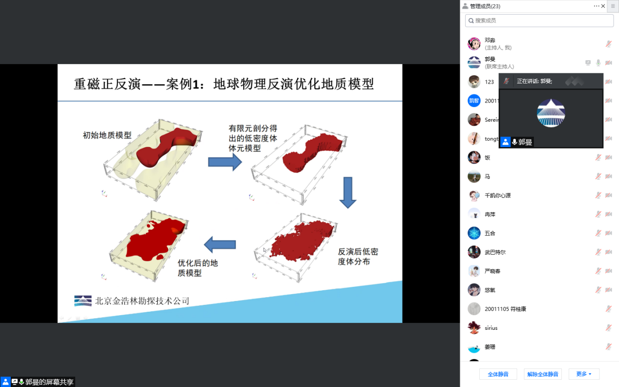 5月19日下午,北京金浩林勘探技术有限公司工程师刘少华和郭曼应邀与QY千亿国际师生开展学术交流,并作题为“重磁数据处理系统”和“重磁数据解释系统”的学术报告。学术报告会采用线上形式,报告会由QY千亿国际邓淼老师主持,校内外部分师生参加了报告会。